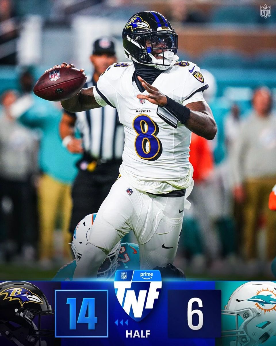 NFL第9周的比赛正式打响,时值万圣节季节,率先开战的巴尔的摩乌鸦和迈阿密海豚的夜赛也带上了浓郁的万圣节色彩,多位球员身穿万圣节服装现身赛场。本场比赛,乌鸦的两届联盟MVP拉马尔-杰克逊伤愈回归,他能打出怎样的表现?海豚上周反弹击败猎鹰,本周他们能否延续状态?带着这些悬念我们一起来看这场比赛。